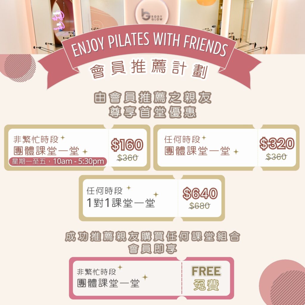 1)預約團體課堂前請先查閱 課堂時間表。所有預約必須以本中心人員確認作準。2)登記人必須為Body Glow新客戶並須提供正確之推薦人姓名及推薦人電話號碼,在經中心人員核實後方可享會員推薦計劃優惠。3)收到以上預約資料後,本中心職員將盡快於辦公時間內聯絡閣下,確認有關預約日期及時間,或請致電2375 6700與本中心聯絡。4)所有課堂只適用於年滿16歲之香港居民。 5)所有即日預約敬請於付款前先致電中心查詢名額 。6)所有於營業日下午6時後、星期日及公眾假期期間提交之預約將於下一個工作天進行確認。7)所有優惠受條款及細則約束,詳情敬請於付款前向中心職員查詢。如有任何爭議,Body Glow將保留最終決定權。